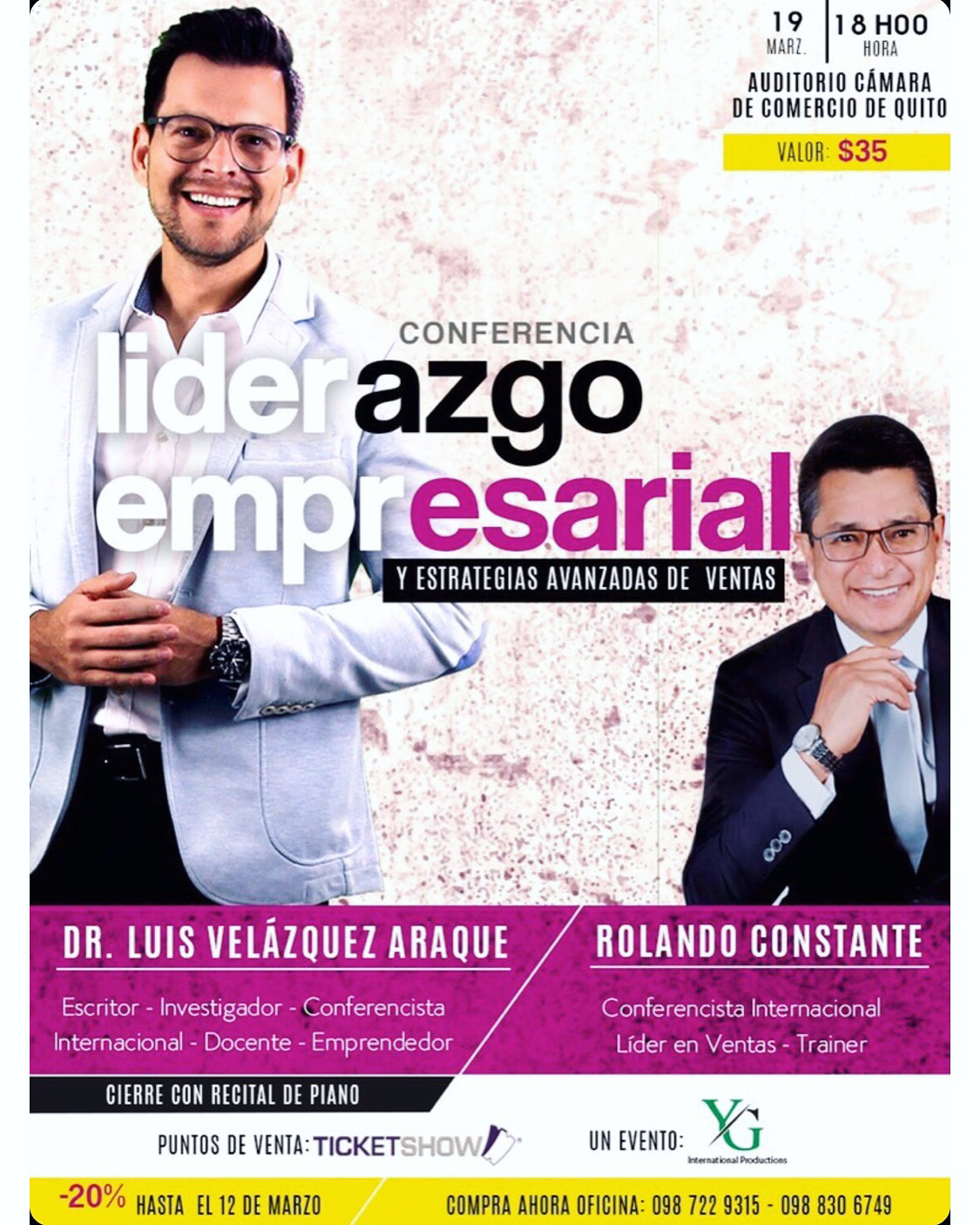 Llega a Quito la conferencia más exitosa en liderazgo empresarial y formación de equipos de ventas, es un encuentro dirigido a empresarios, supervisores, emprendedores, ejecutivos de ventas. Esta conferencia brinda las estrategias, tendencias y herramientas, que te permitirán ser exitoso en tus negocios. dos ponentes internacionales en un solo escenario, LUIS VELAZQUEZ ARAQUE Y ROLANDO CONSTANTE en un solo escenario nos harán vivir una experiencia de aprendizaje inolvidable. no te lo puedes perder.